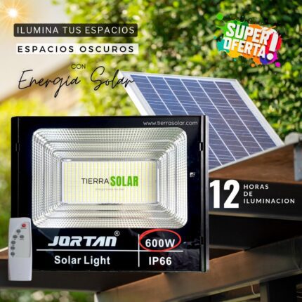 Características Reflector Solar JORTAN Panel 30W : Monocristalino Medida panel: 58×35 cm v Medida cable panel: 3.5 metros Reflector: 600W